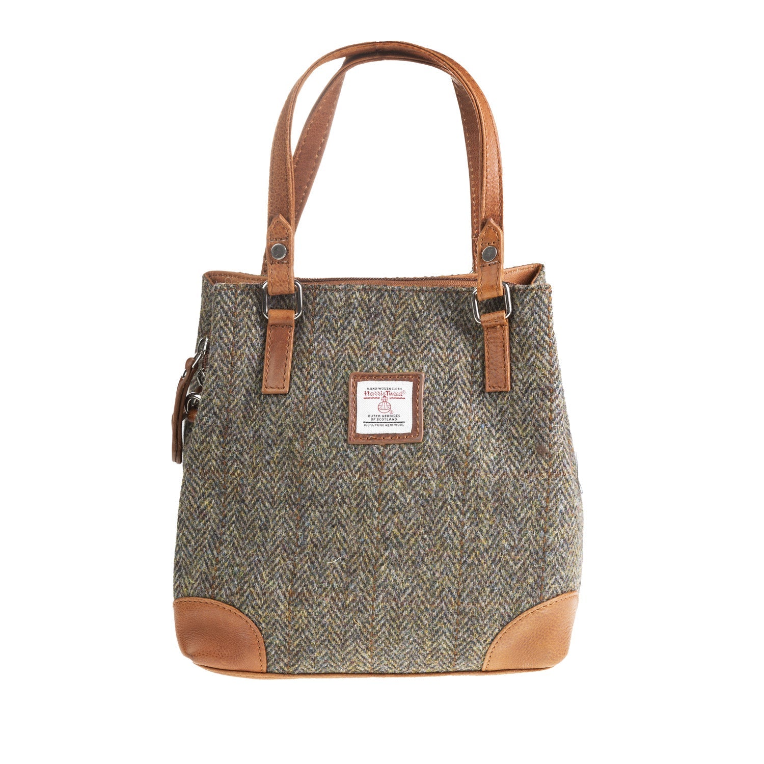 Ladies Harris Tweed Leather Hand Bag Brown Herringbone / Tan