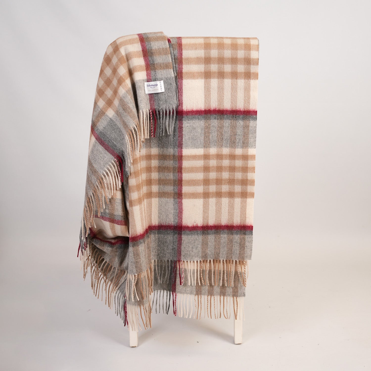 • Timeless Style: Elegant checked patterns in neutral and warm tones with a pop of red, finished with classic fringed edges.