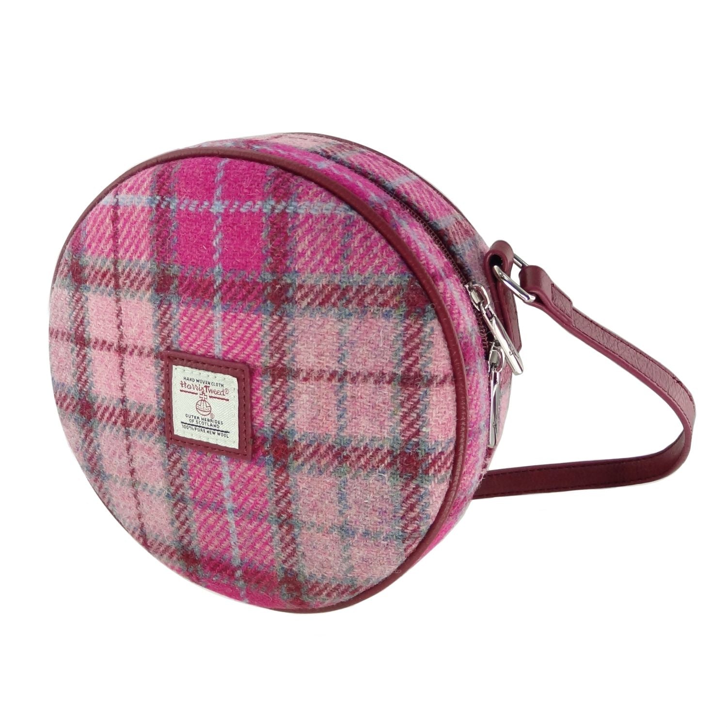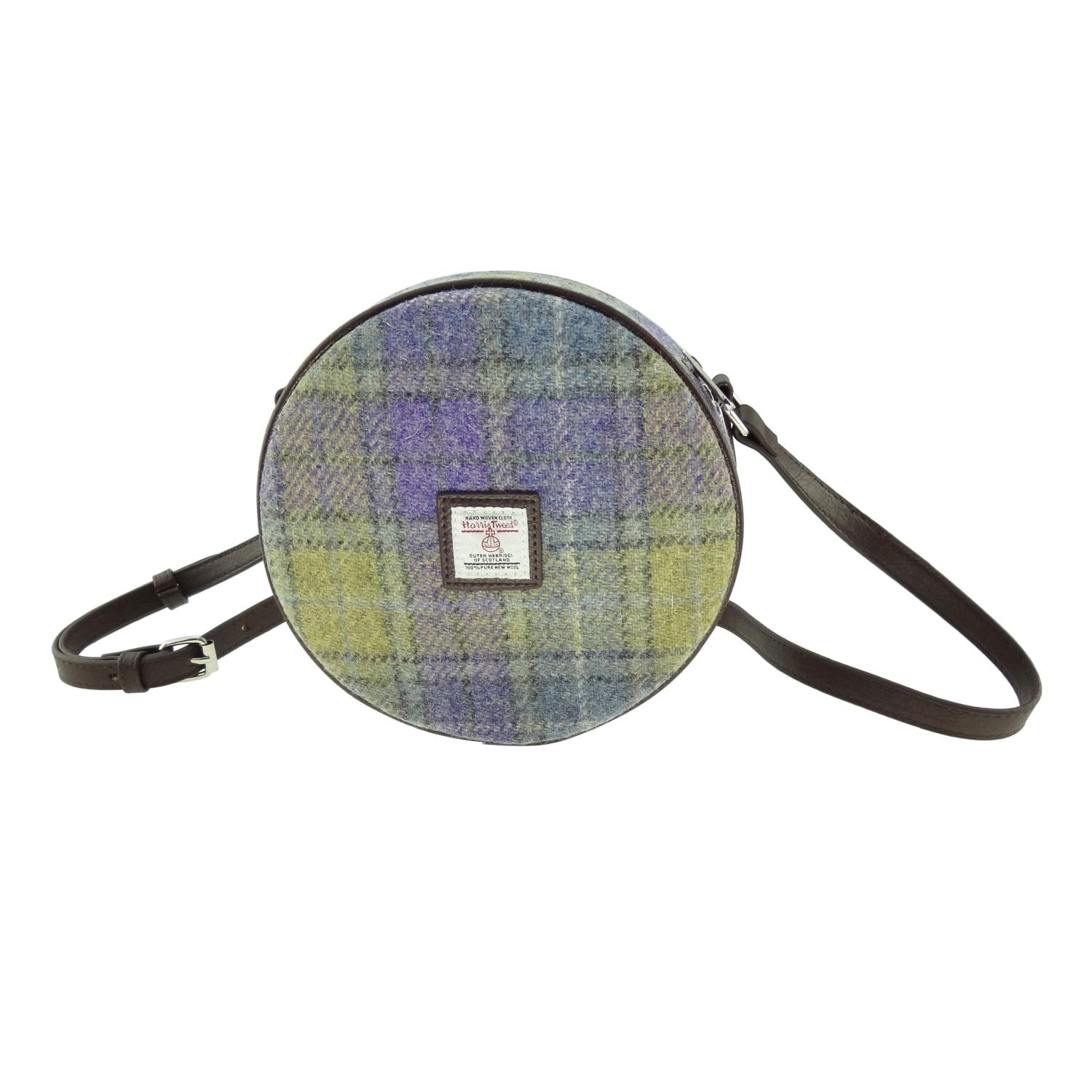 The Harris Tweed Bannock Round Bag is a striking circular crossbody bag made in the UK using genuine Harris Tweed.
