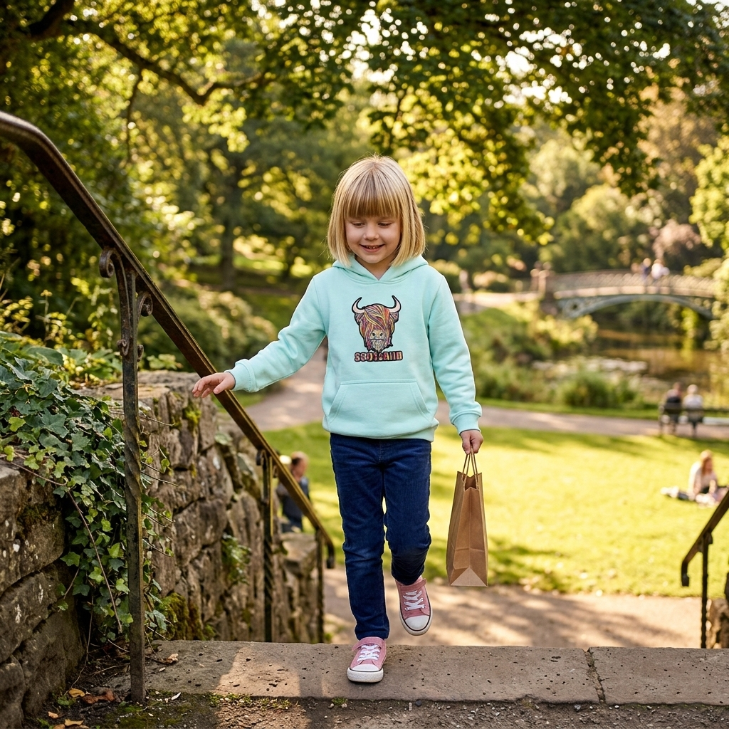 Add a touch of Scotland to your child’s wardrobe with this Kids Pastel Highland Cow Hoodie in a beautiful aqua shade. Featuring the iconic Highland cow – a proud symbol of Scotland – this children’s hooded sweatshirt combines heritage style with everyday comfort. Made from warm, soft-touch fabric, it is perfect for keeping kids cosy during cooler days at school, on family trips, or outdoor adventures.