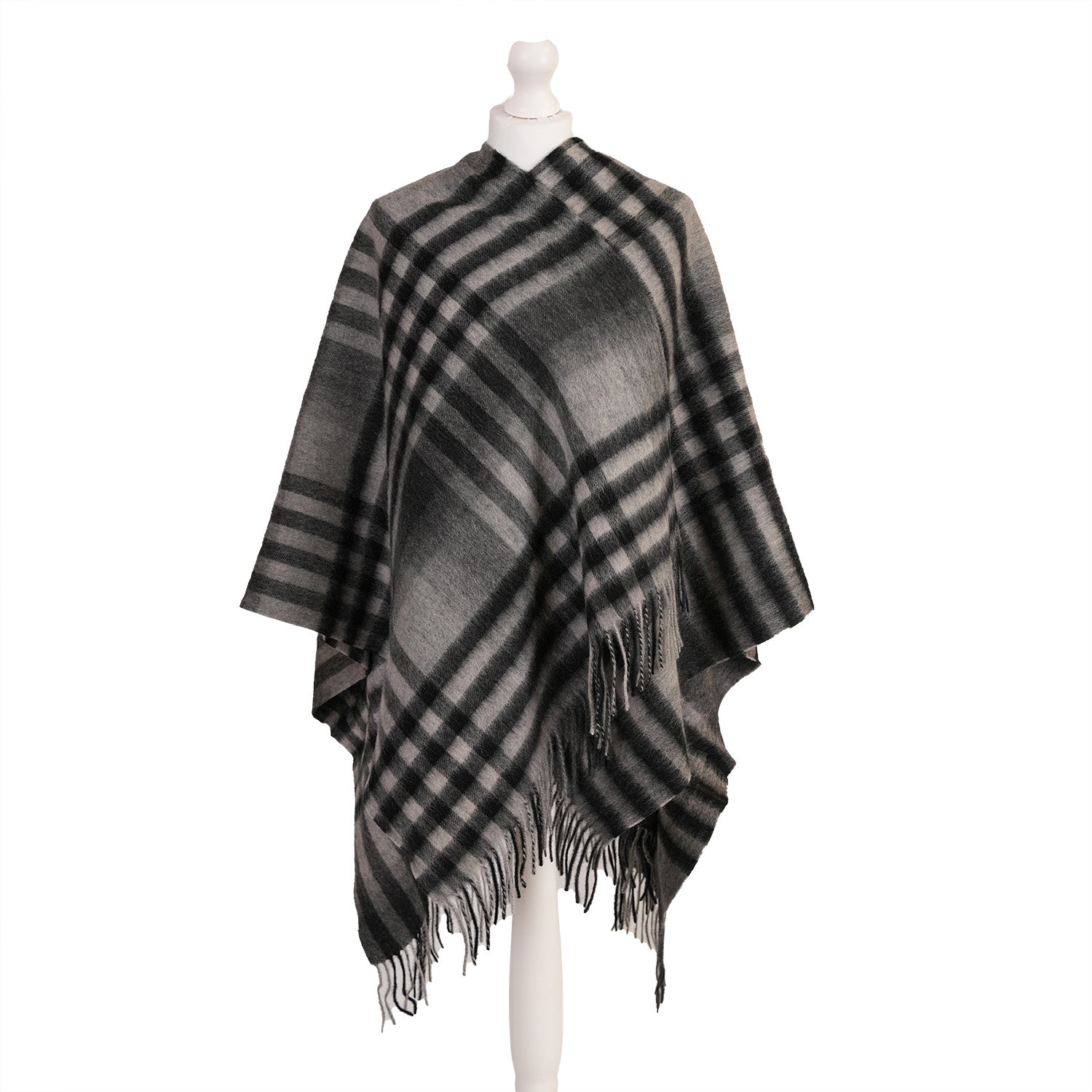 • Classic dark grey chequered tartan design with fringed edges